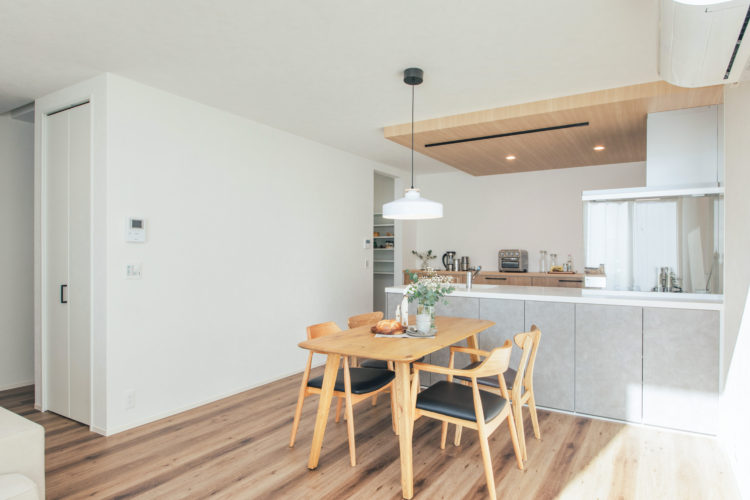 フラットな対面キッチンを採用し、家事をしながらでもお子さまの様子を見守れる安心設計。 家族が自然と集まり、会話が弾む心地よいリビングダイニングに。