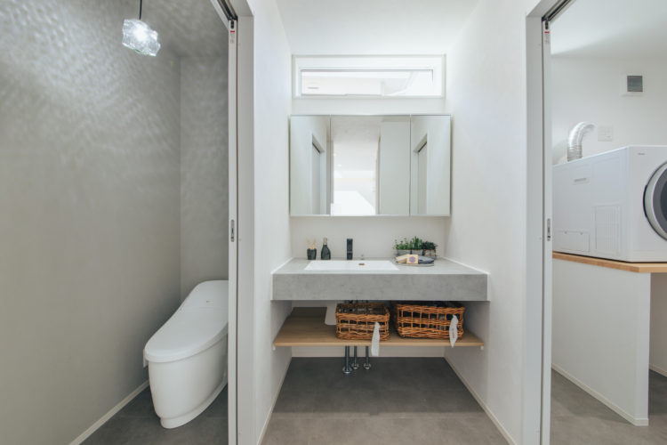 トイレ→洗面→脱衣→浴室が一直線に並ぶ、効率的な水回り動線を採用。 朝の忙しい時間帯でも家族がスムーズに使える設計で、ストレスフリーな身支度を。 洗濯や掃除の動線も最短ルートで移動できるため、家事の負担も軽減。 スッキリと片付く収納スペースも充実し、使いやすさと快適さを両立した空間。