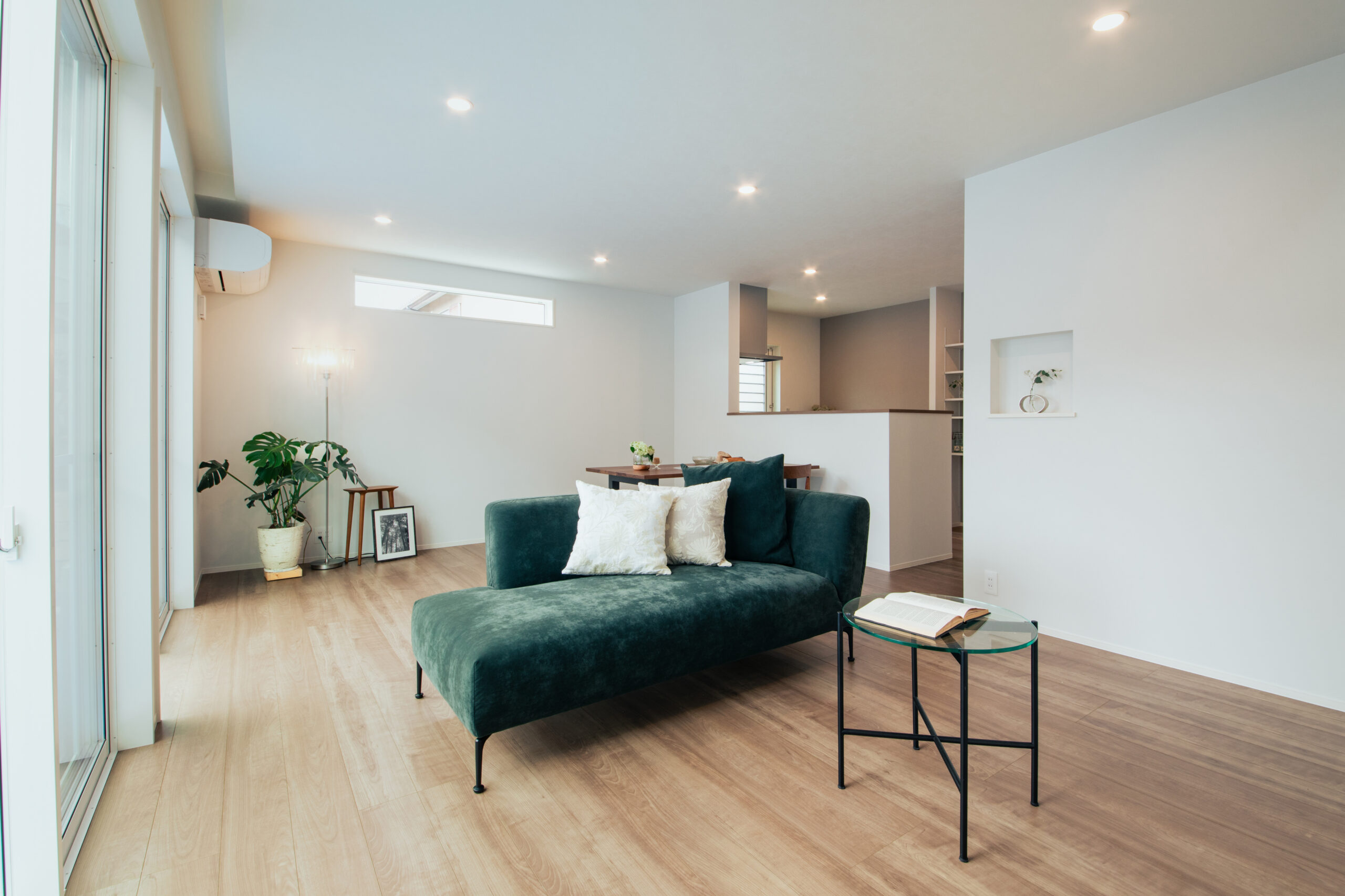 白い壁とナチュラルな木目の床をベースに、深緑のソファや観葉植物が彩りを添え、ご夫婦のセンスが光る心地よい空間です。