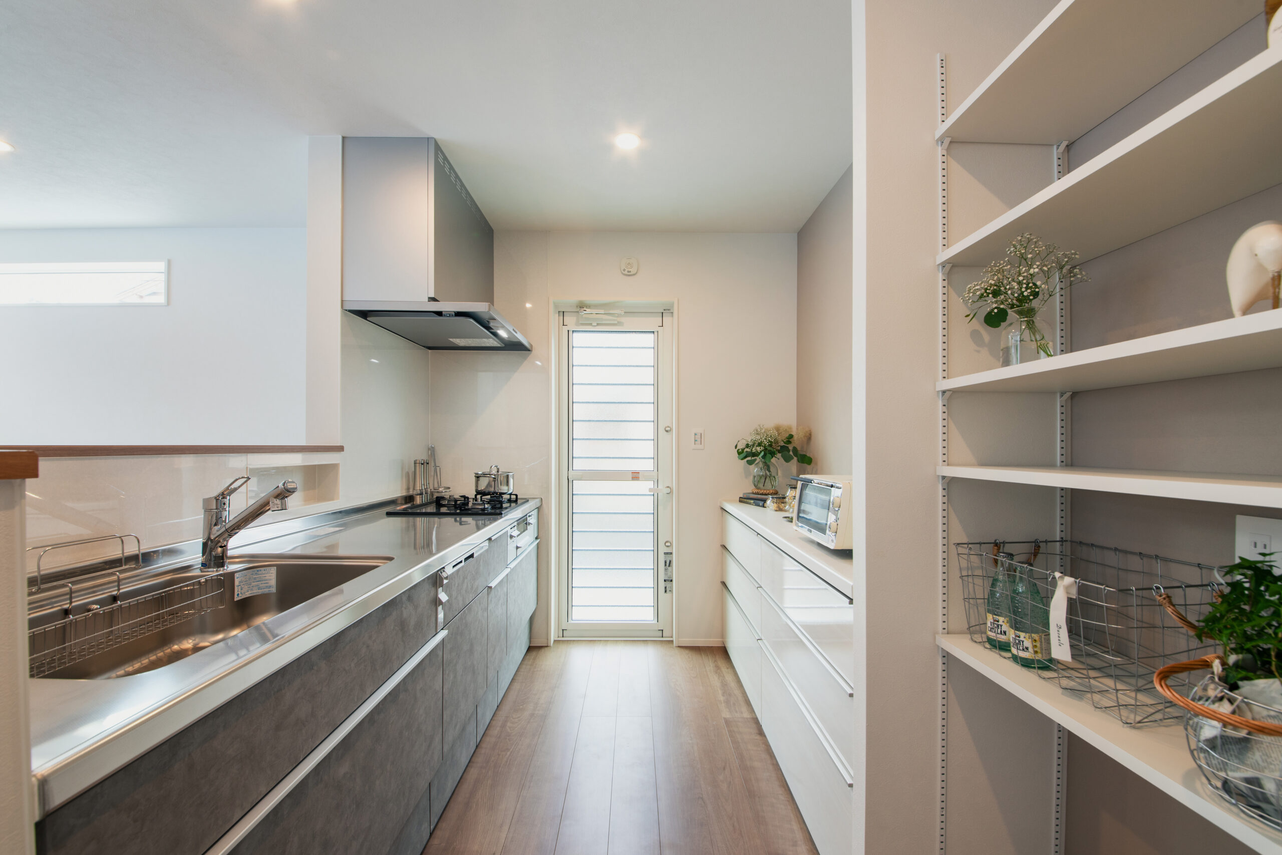 キッチンには背面のカップボードに加え、隣には大容量のパントリーを設置。