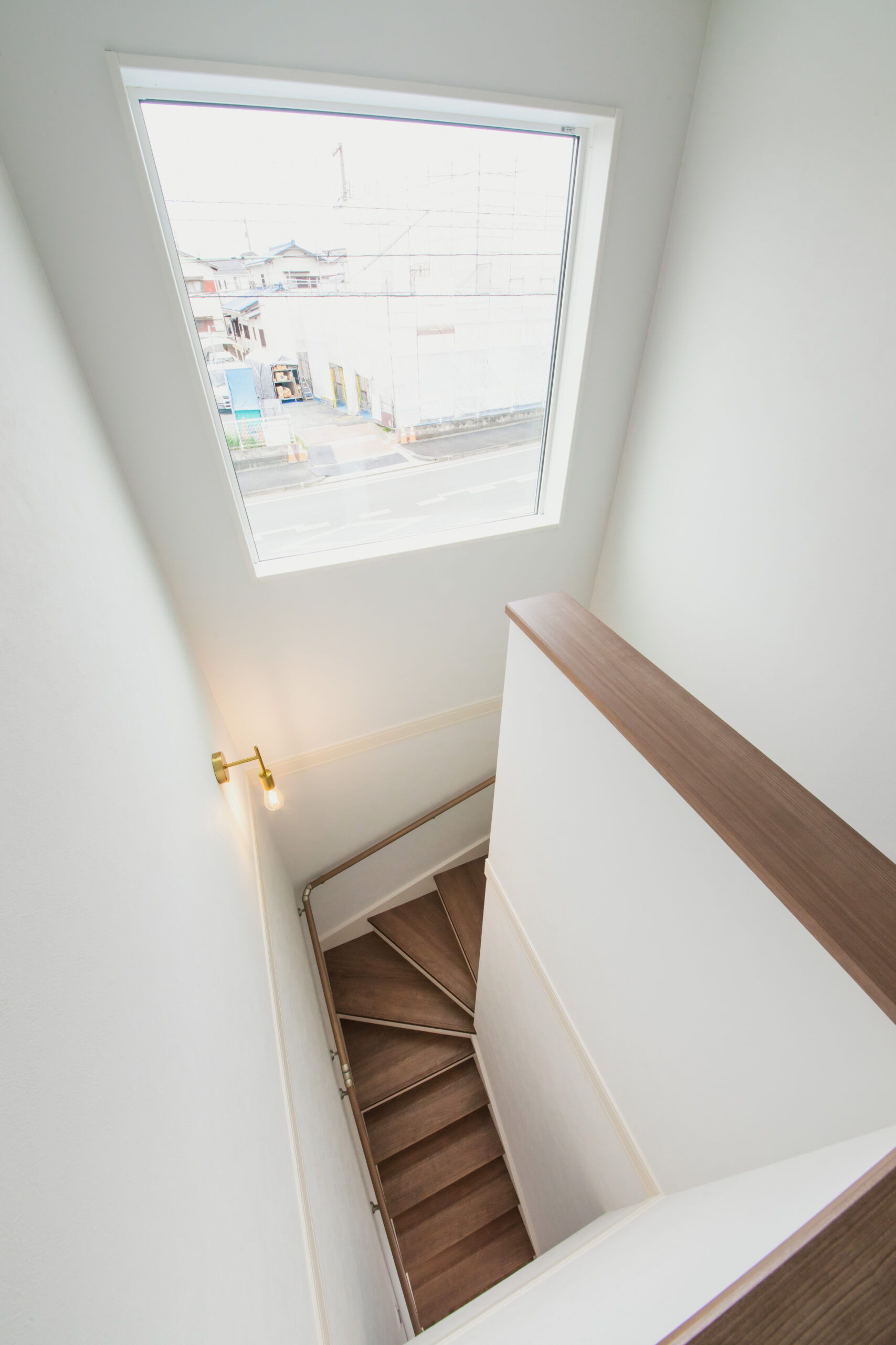 階段の折り返し部分に大きな窓を設置し、暗くなりがちな階段ホールを明るく照らします。